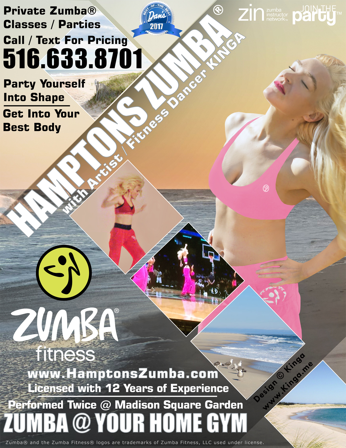 Zumba® Dance Fitness in the Hamptons Long Island New York with European-American artist/fitness dancer Kinga presenting high-energy cardio, charismatic dance fitness classes, a calorie-incinerating cardio workout focusing on weight loss and body toning disguised as a dance party. Learn how to move your body feminine supreme with burning charisma. Become part of the ongoing fun of getting-into and staying-in shape! I invite you to step out of the realm of the grey-every-day for an hour of shapin' while shakin' and dance all negativity away. Looking forward to meeting you! |